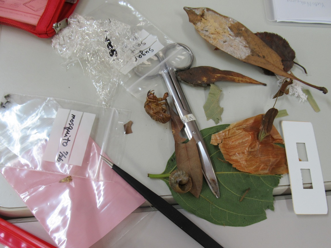 引率講師がサンプルとして準備したものは、砂糖(sugar)のほかに、透明のジッパー付き袋に、先生が自宅で仕留めた蚊が数匹(mosquitoes)!