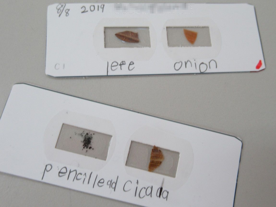 上の写真では、木の葉(leaf)、玉ねぎ(onion)、鉛筆の芯の粉(pencil lead)、セミの羽(cicada wing)が使われています。